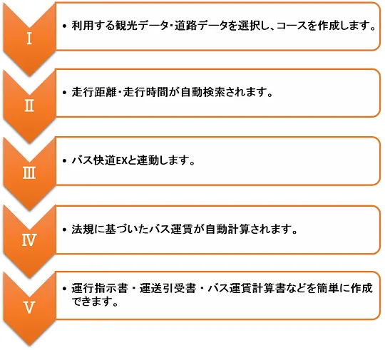 「運行コース作成機能」では、バスルートの走行距離・走行時間を自動検索しますが、「交替運転者の配置基準」による運転距離や運転時間を超える場合には、『交替運転手が必要』との注意メッセージが表示されます。