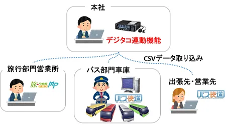 「デジタコ連動機能」は、「バス快道EX」のバス配車管理(予約データ)とデジタコデータを車両単位で自動連動させ、 日々入力される日報入力作業を確実に軽減します。